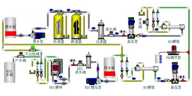 预处理+二级RO+EDI系统  电阻率≥15MΩ·cm 适合:对电阻率要求稳定在15兆欧以上的超纯水;